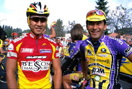 選手が束になってやってくる方向へ歩いて行くが、トニステイナーのチームカーは見当たらない。スタート時間が迫りつつあるので、断念してUターンし始めると、後方から私を呼ぶ声が。真っ黒で国籍不明の三船選手が横を通りすぎていった。三船選手がサインし終えるの待ち、コース上で話をしていたところへ水谷選手登場。これで、ヨーロッパで活躍中のトッププロ2人が揃った。私はこっちでよくレースを観に行っているけれど、2人の日本人選手が参加したレースを見るのは、98年にサンドゥニでサッカーW杯の前座的に行われたレースでの橋川選手&三船選手以来これが2度目。応援のし甲斐が2倍あってうれしい。それに、くどいようだが周りはすごいメンバーだし。 |
