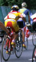 | 久々に会った2人はプロ同士の話に花を咲かせ、あっという間にスタート時間になった。私はベッソンショッスールのマッサーをしているアランの車に同乗させてもらうため、チームカーへと向かう。スタートしても、スタート地点を数周してから、大回りするコースなのでスタート後も楽しめる。1周目、1人が逃げていた。2周目、数人が逃げていた。横でアランが「タケ〜!」と叫ぶ。「チホ、先頭にタケがいたの観たか?」と言われたが、カメラを除いていた私の眼中にそれらしき人は…。それもそのはず、私の目に映ったレースは横の写真だったから。こんな良いポジションにいたとは。 何はともあれ、幸先好調でレースが始まった。 |
