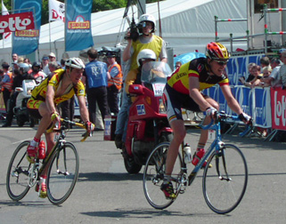 そんなワケで、レースに参加した選手たちの大半が練習がてらの参加だ。こんなレースだけど、先頭の選手はもちろん必死。昨年は、エッリ(イタリア、ドイツテレコム)が勝っている。今年このレースを必死に走ったのは、フェスティナとの混成チームで参加のAG2rのカスプティス。レース中盤、一人で逃げていた。しかし、地元ベルギー選手たちが見逃すわけがなく、後半つかまってしまう。そして、終始逃げグループに入っていたメルクス(ベルギー、ドモ)が、ナミュールの城塞の上りでアタックをかける。これに、ストルメルシュ(ベルギー、ブランデーレン)がピッタリつく。あと1周してゴールだ。2度目の城塞の上りで、観客の期待を一身に受けたベルギーチャンピョンのメルクスは、アタックをかける。必死で追うストルメルシュが、追いつきそうになるが、メルクスは意地で逃げ切りゴールした。