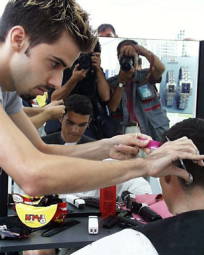 今日は、朝のヴィラージュで、ヴィランクが無料の散髪をしていました。カメラマンが、ここぞとばかりに撮りに来ていて、すごい人だかりでした。私はちょうど、近くのテーブルで他のジャーナリストと話をしていたので、難なくヴィランクの散髪風景を後ろから撮る事が出来ました。数日後のシャンゼリゼのゴールに向けて、いろんな選手たちが散髪をしてもらいに、来ていました。私もしてもらおうかな?