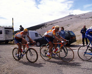 木が生えない石の山モンヴァントゥーに行くのは初めてで、私にとっては今年のツールで一番楽しみなステージでした。風は強かったのですが、朝から晴天で絶好の観戦日和。沿道にはあふれんばかりの人たちがいて、雨のオタカムとはえらい違いでした。あ〜、こんなことならヴァントゥーを歩くんだった…しかし、山の上はむちゃくちゃ寒くて風も強く、車でよかったなぁ〜なんて思ってしまいました。ヴァントゥーはプレスカーとは言え車の規制が厳しいので、私たちは頂上へは行かずに3〜4キロ手前に車を止めて見ました。全部に木が生えていないのかと思っていたのですが、ふもとの方は木があって、頂上手前6キロくらいから、白い石ばかりの山肌でした。あんな風の寒い中、選手はよく走るなぁと思ったヴァントゥーでした。(あ〜、時間がないのでおしまい)