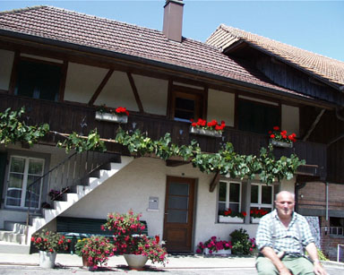 | スイスのコース横のお家。 おじいちゃんが椅子を持ち出し、家の前で観戦してました。 車の中から撮ったので、おじいちゃんの足切れちゃったぁ。 (Photo;chiho) |