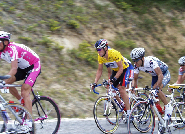第13ステージでのランス・アームストロング 前にヤン・ウルリッヒ、横にクサビエ・ジャン。