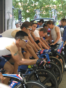 | USポスタルのウォーミングアップ風景。 手前から4人目がアームストロング。 かなり気合が入ってました。 |