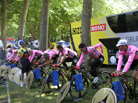 オンセのウォーミングアップ風景。先日、悲しいことに落車 で、リタイアしてしまったベロキは、手前から2人目。 |